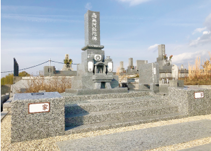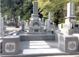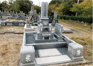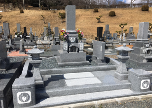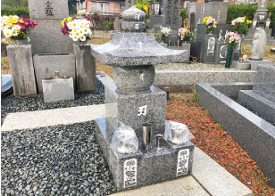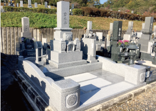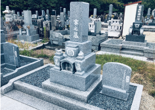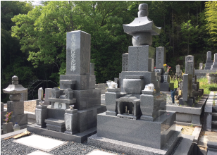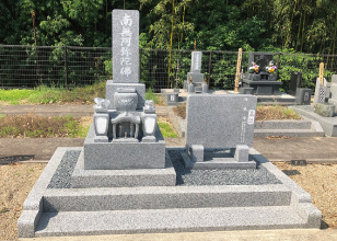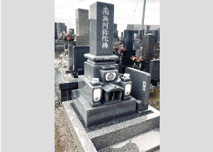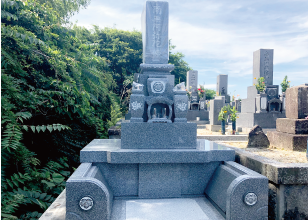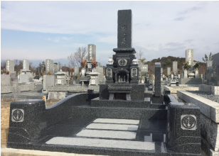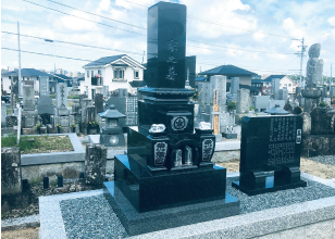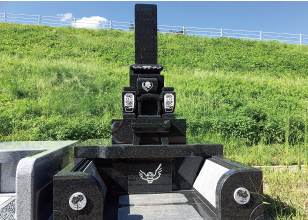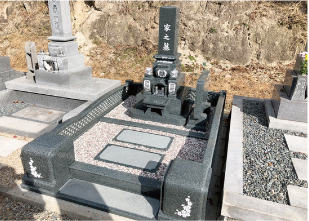「黒いお墓が良い」というご要望があり、色が良く高級感がある富士ブルーをおすすめしました。品質に対してお値打ちな石種で、予算内で良い石を探し、広めの区画に意匠を凝らしたお墓をお納めすることが出来ました。 |