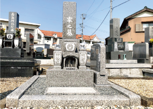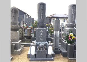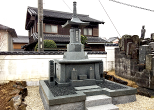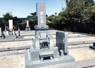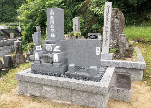 地元の銘石「鍋田石」を使い、全て自社加工による建立です。 先代の住職のお墓も当社で建立させていただき、そのご縁で現職のご住職のお墓も承ることになりました。生前に、ご自身のお墓を建てておきたいというご要望で建立させていただきました。 |