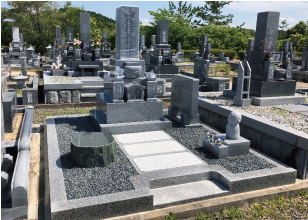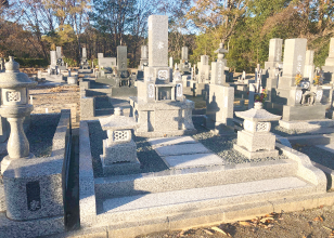 実際の墓地をご案内いただき、様々な実際のお墓の中から「この石の感じが良い」という石を選んでいただきました。 広いお墓だとお墓の草取りなどメンテナンスが大変ですので、少しでも負担が減るように、防草土を施した上に玉砂利が敷いてあります。 |