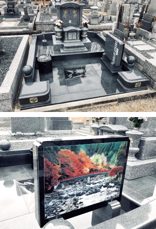 お墓正面の踏み石や物置き台などに施された装飾は「影彫り」という技術によるもので、磨き上げた黒石に細かくキズを入れることで白く見えるようにして描いています。墓誌板の裏にはこの影彫りの技術を使って描いた風景に塗装を重ね、故人の出身地である香嵐渓の風景を再現しています。 |