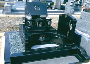 石はインドのSG2。影彫りを施したときに黒白のコントラストが際立って美しい、艶のある美しい黒石です。 展示場をご覧いただいてデザインを決め、古瀬間の区画にピッタリ収まるように設計させていただきました。 トラック運転手だったお父様を偲んで、正面にトラックの影彫りを施しました。艶のある石の特徴を活かした、シックな仕上がりのお墓です。 |