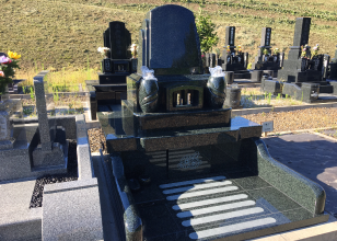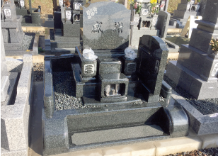「デザインは同じで、石の種類は別のもので」というご希望をいただき、施主様がその色を気に入られた中国産の緑青みかげを使って建立させていただきました。 |
