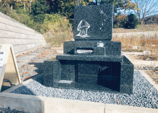 お打合せを重ねてメリハリのある2色の石をお選びいただき、縁起の良いフクロウの彫刻を入れるなど、オンリーワンのお墓が出来あがりました。 |